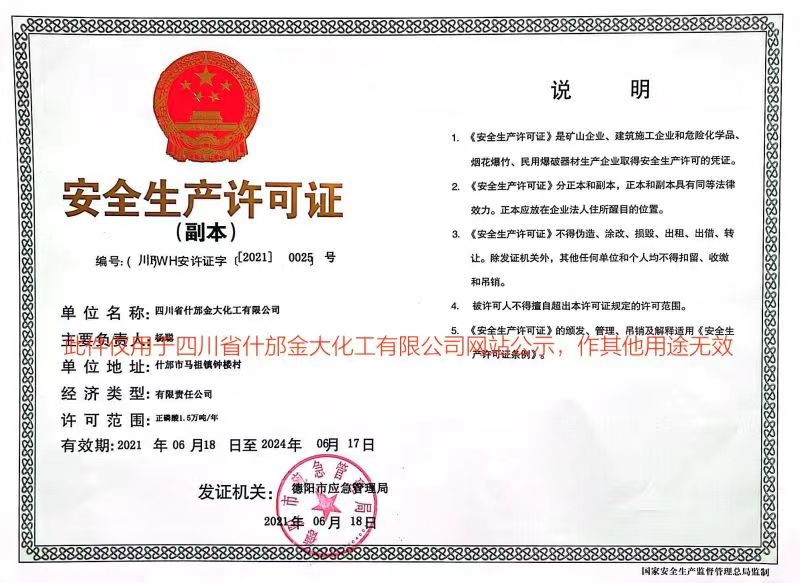 四川省什邡金大化工有限公司-是位于中國四川省的一家專業生產磷化工系列產品的廠家。所處地理位置資源豐富,交通便利,緊鄰成綿高速復線,距離兩路口火車站1000米。公司成立于1996年,多年來一直從事磷酸鹽的開發與生產。公司擁有職工65余人,其中各類工程技術人員20人,資產總額5000萬元,占地11000余平方米。